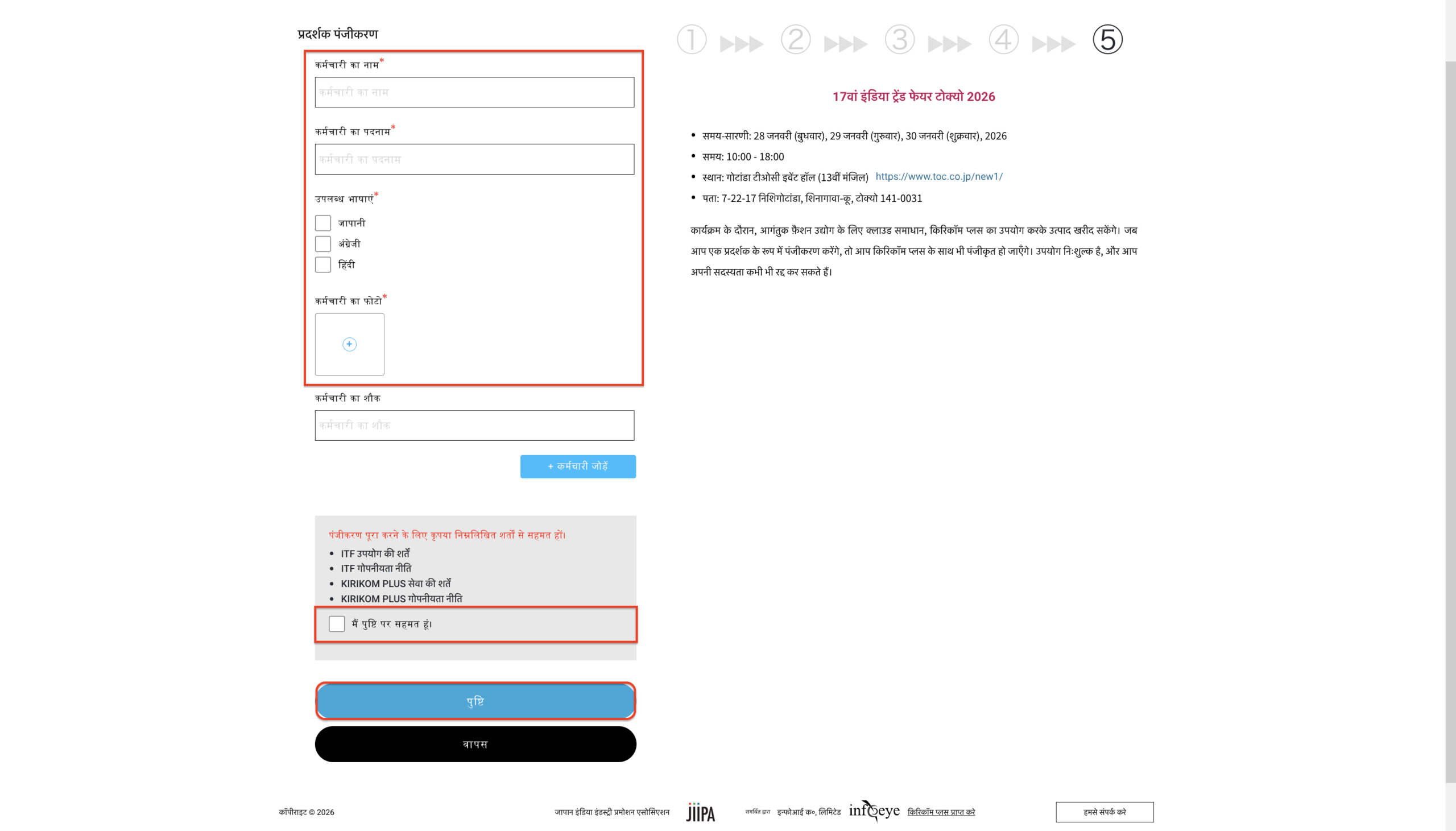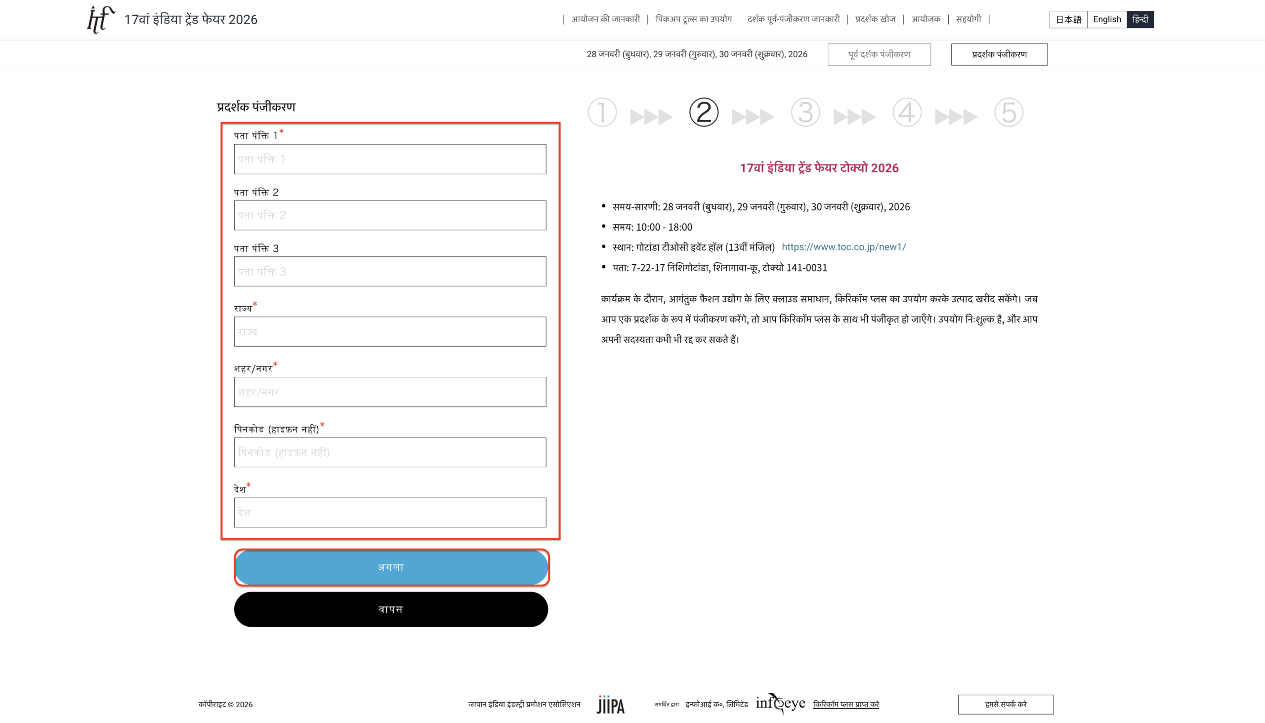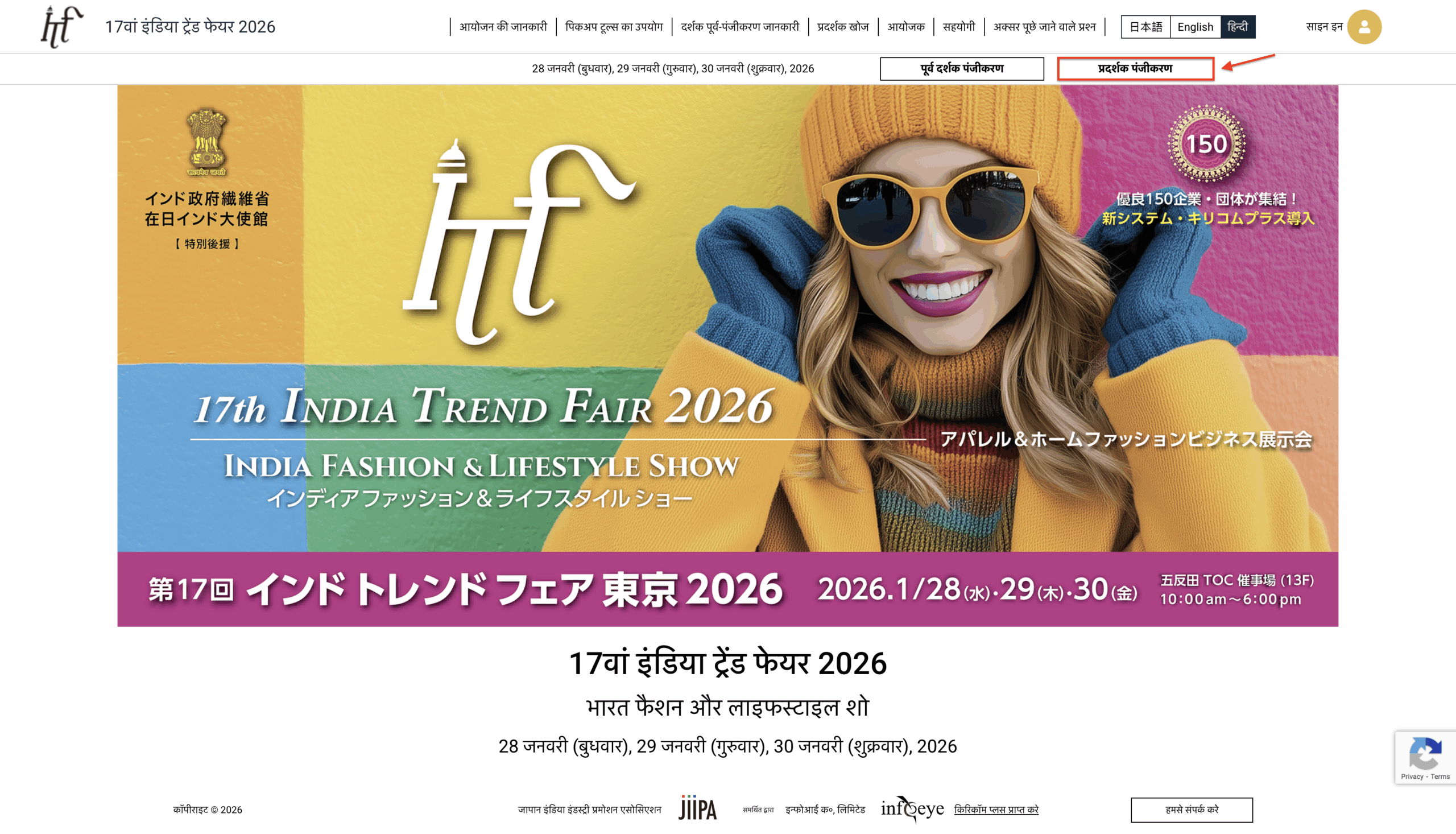 - 17वें इंडिया ट्रेंड फेयर टोक्यो 2026 के लिए वेबसाइट होमपेज के शीर्ष पर स्थित “पूर्व दर्शक पंजीकरण” बटन पर क्लिक करें।