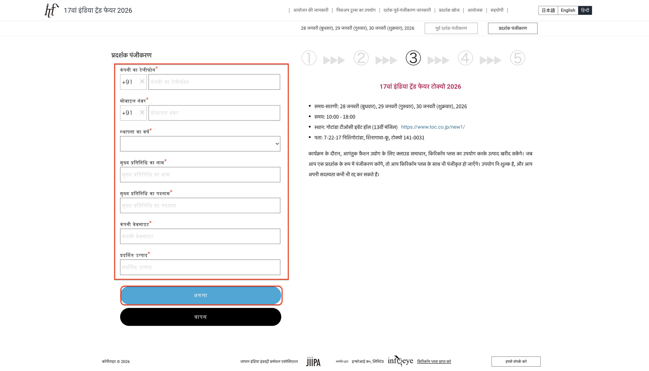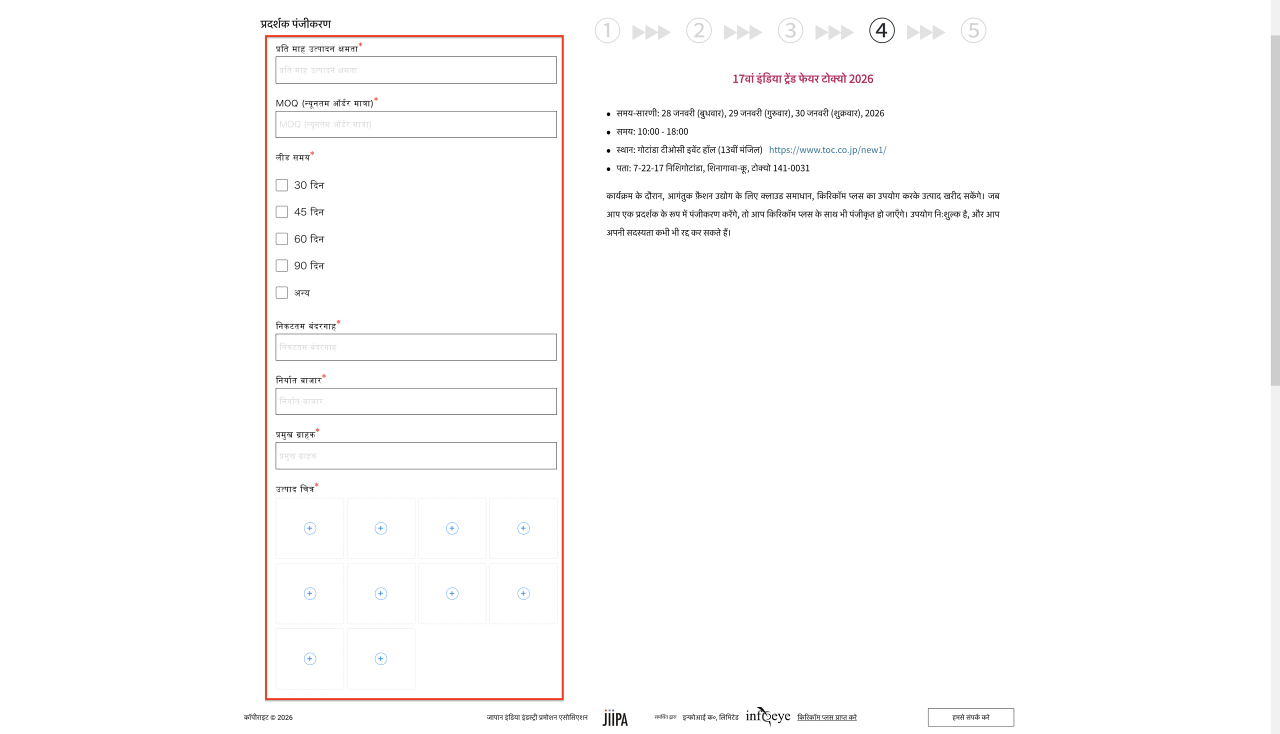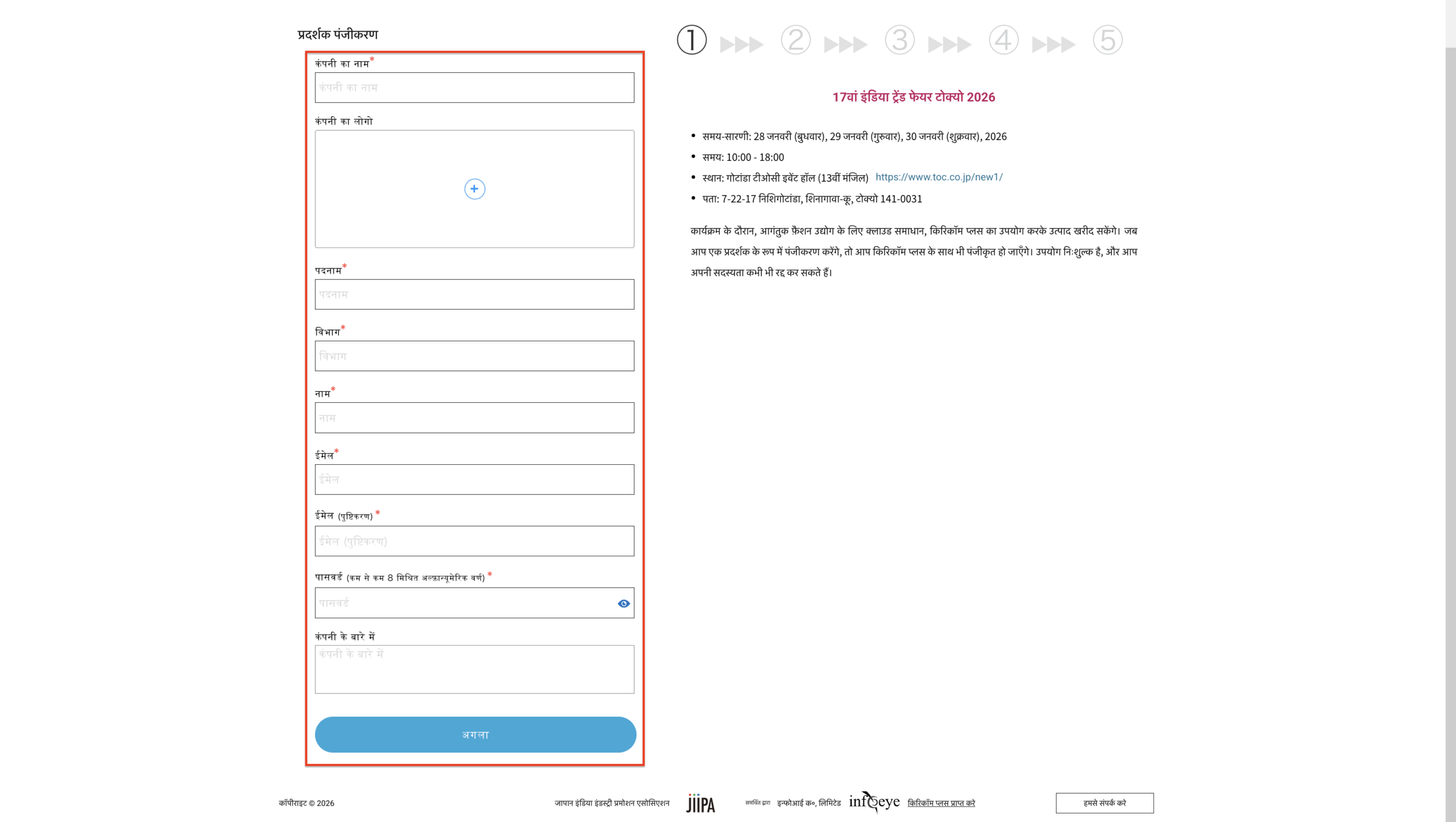 - 17वें इंडिया ट्रेंड फेयर टोक्यो 2026 वेबसाइट होमपेज के शीर्ष पर “प्रदर्शक पंजीकरण” बटन पर क्लिक करें।