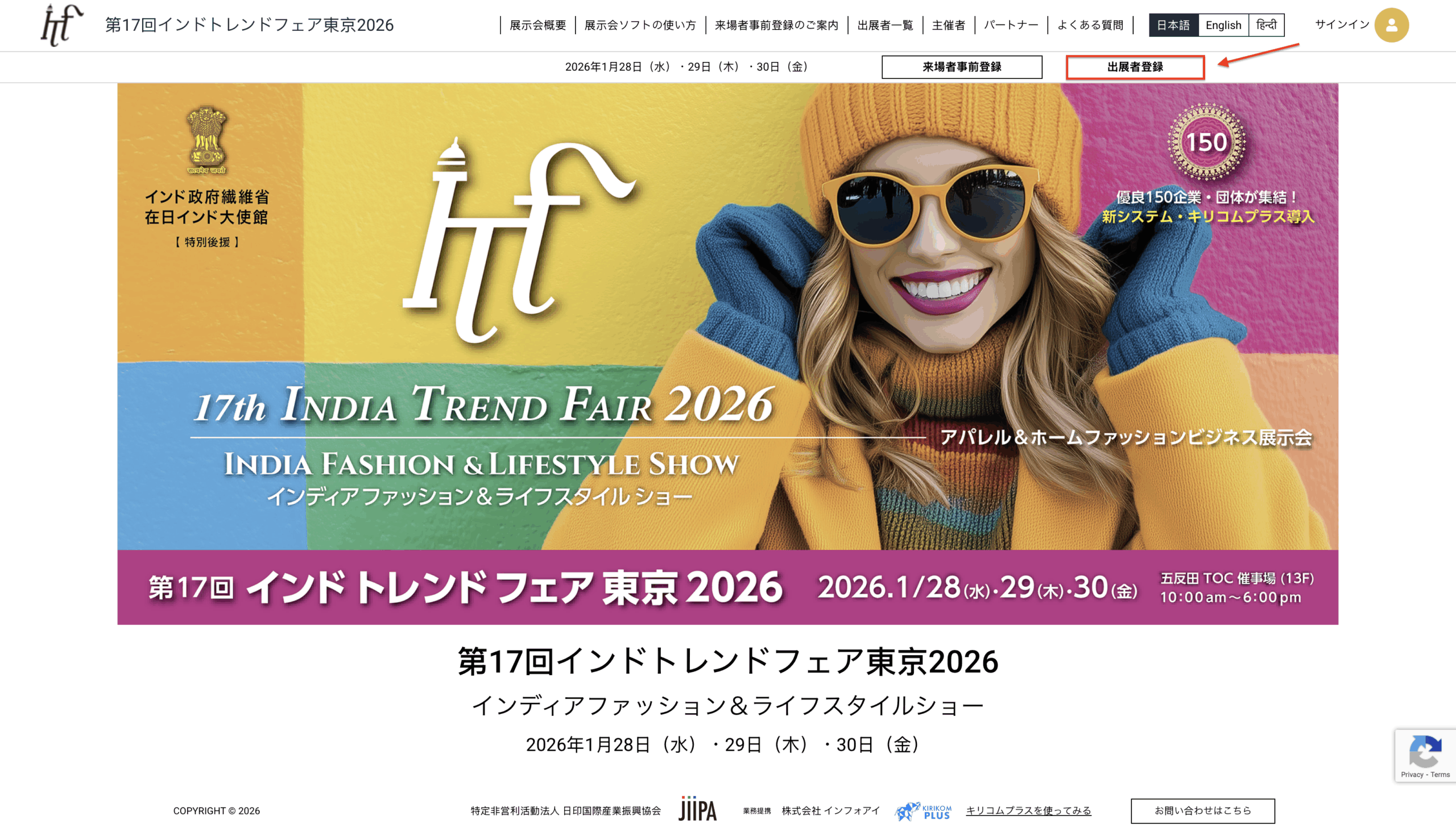 - 第17回インドトレンドフェア東京2026ウェブサイトトップページ上部の「出展者登録」ボタンを押下します。