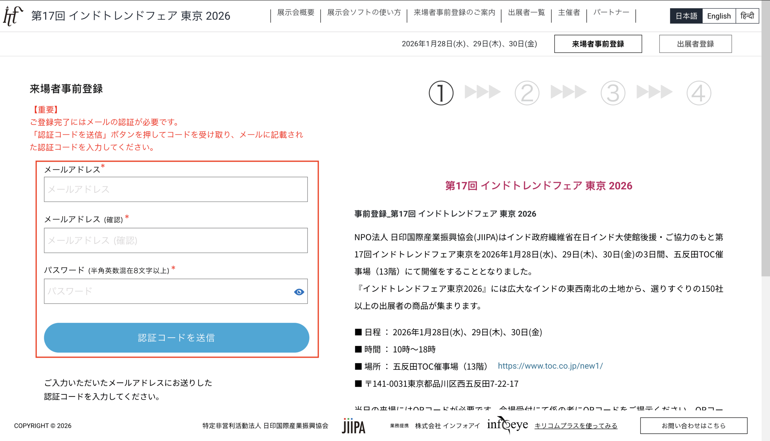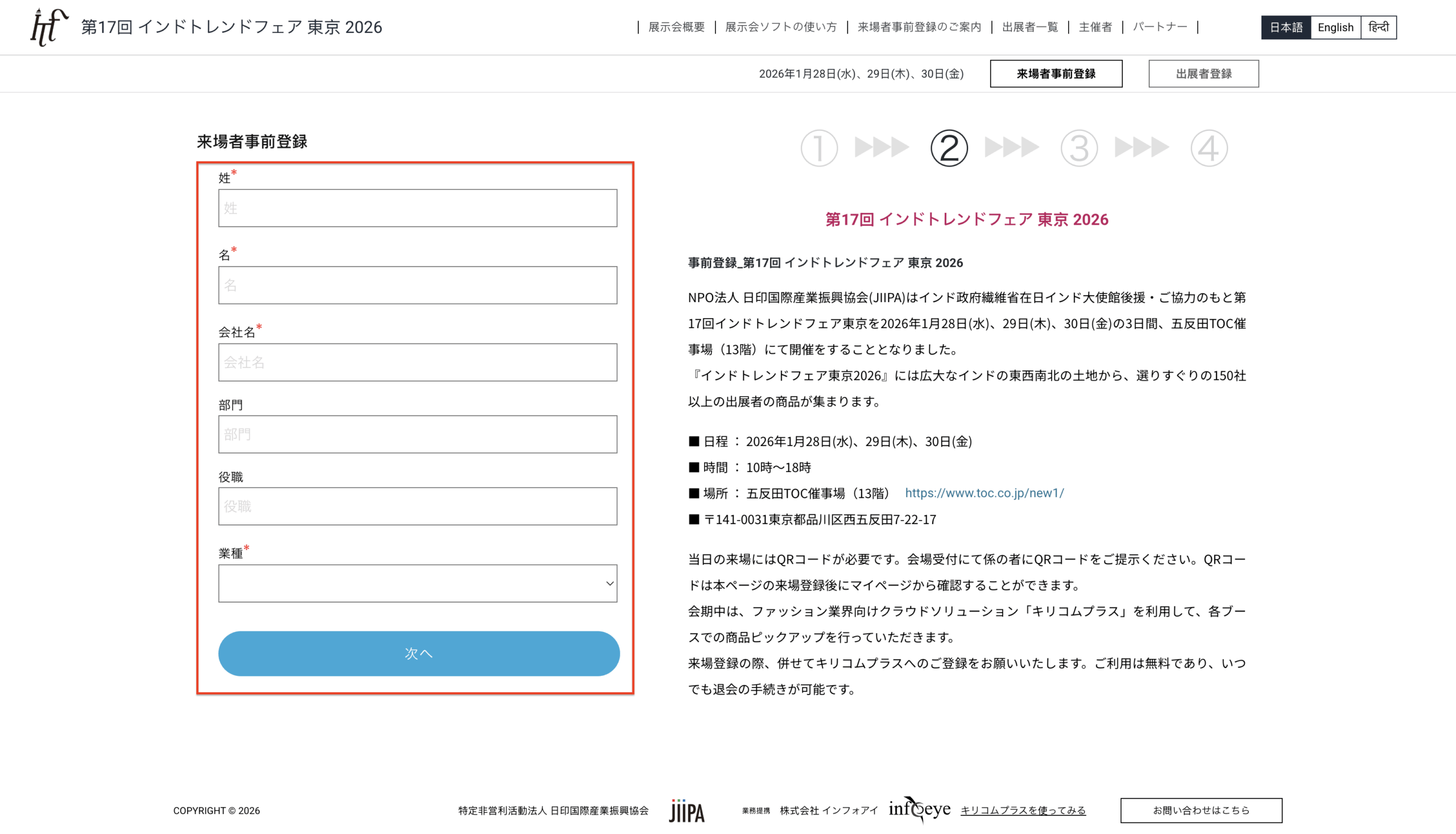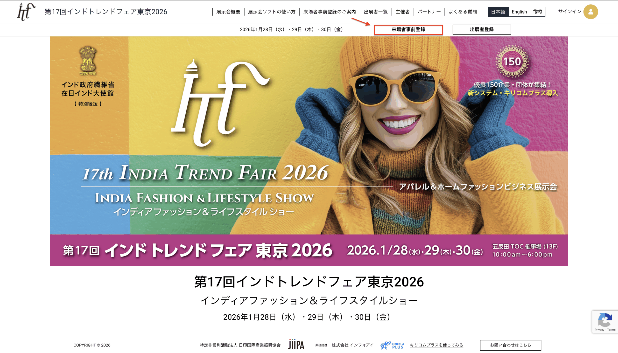 インドトレンドフェア東京2026ウェブサイトから来場者登録を行います