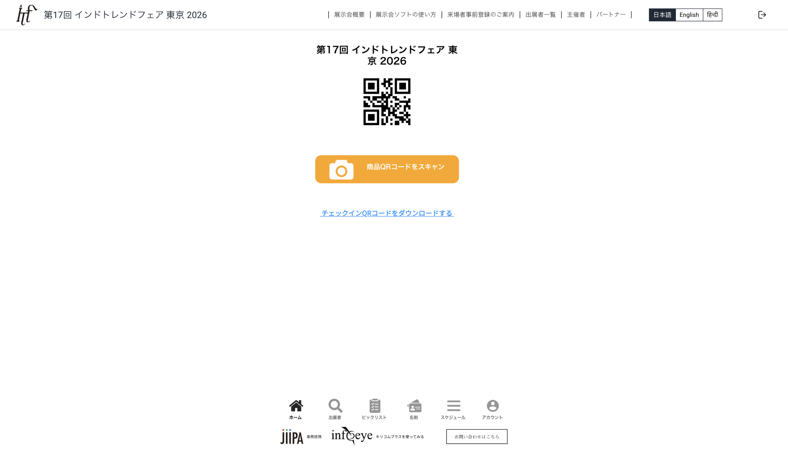 - マイページでは、チェックイン用QRコードの表示のほか、登録情報の確認や変更、出展者検索、ピックアップ内容の確認が可能です。