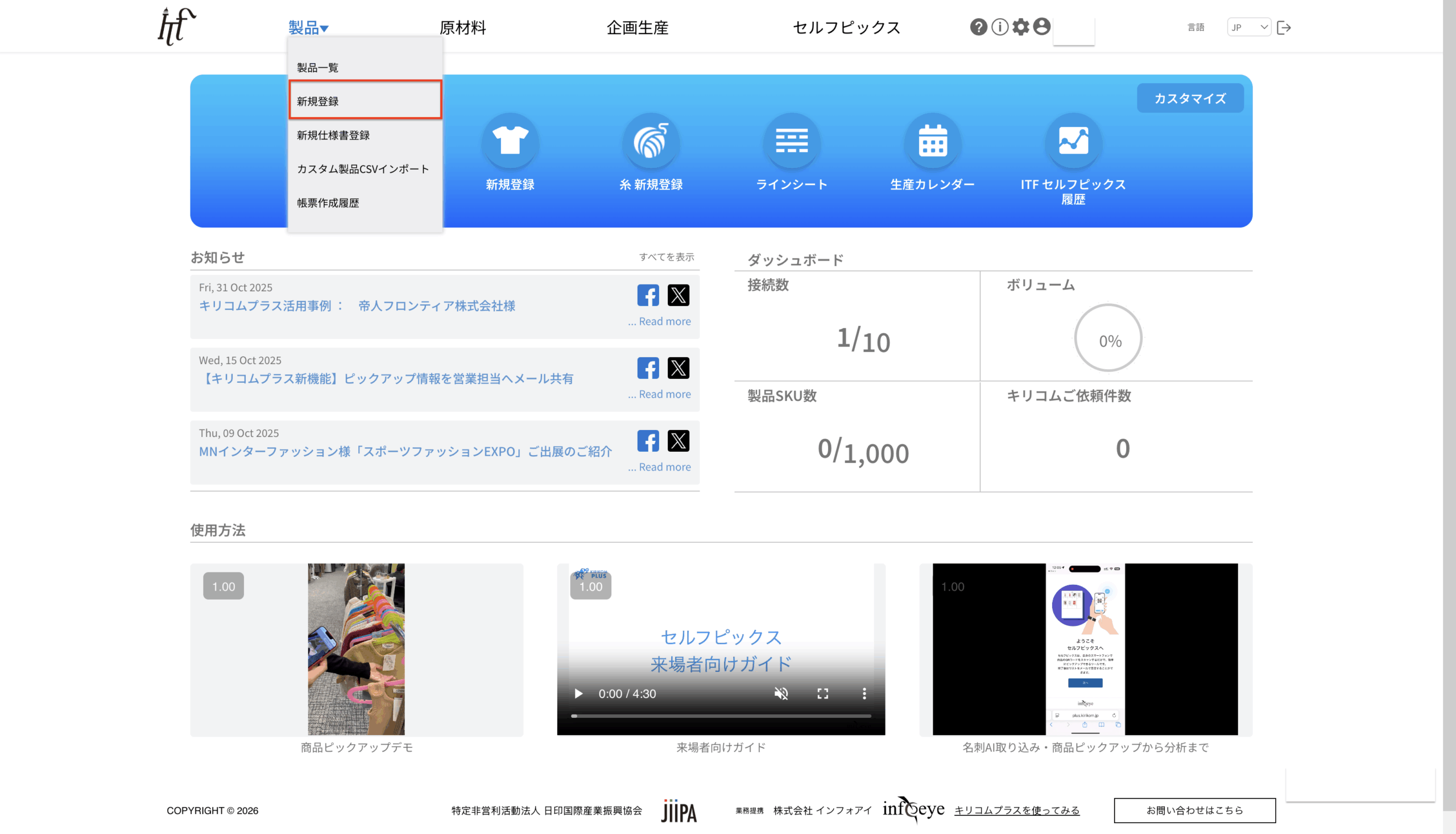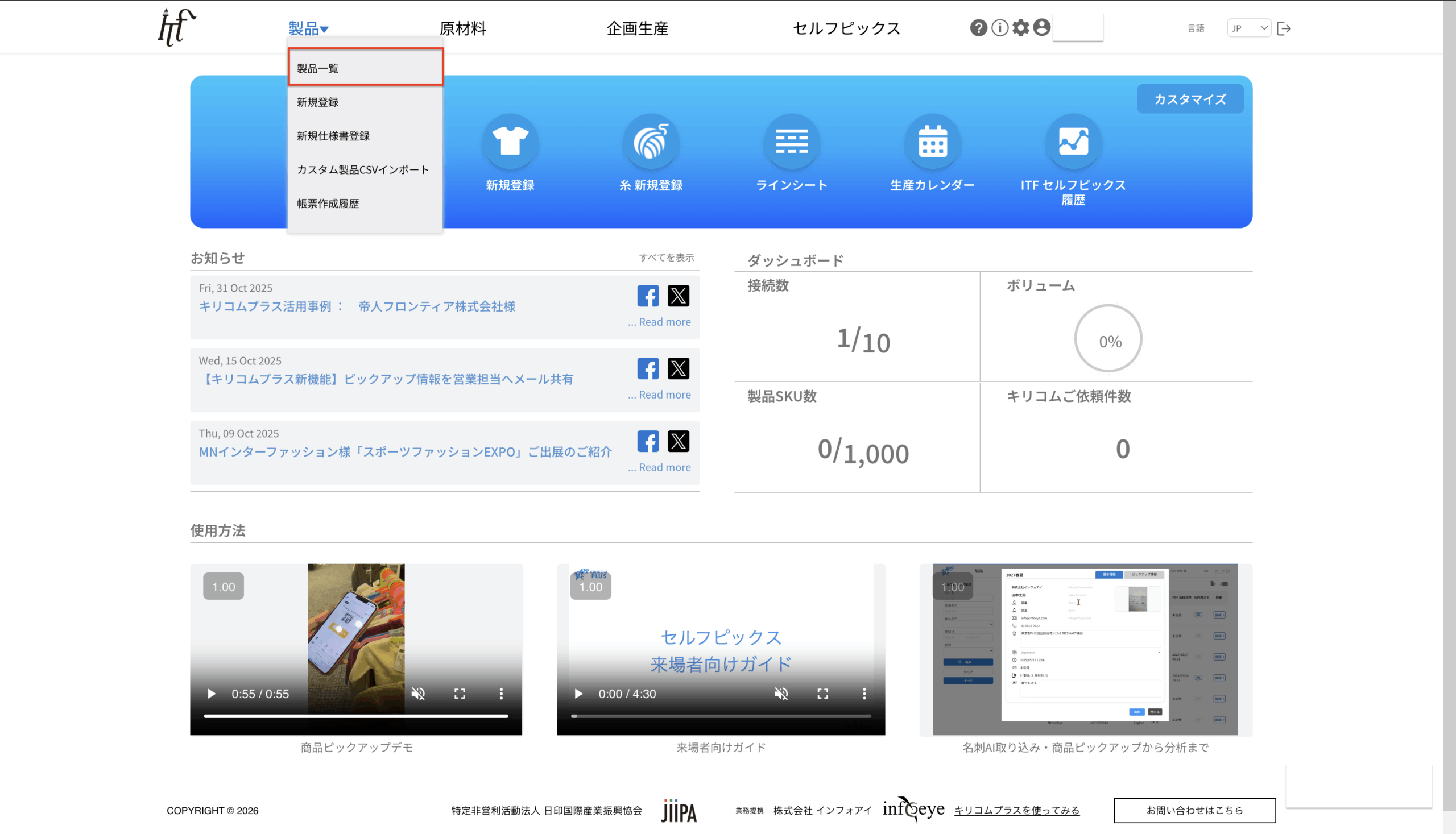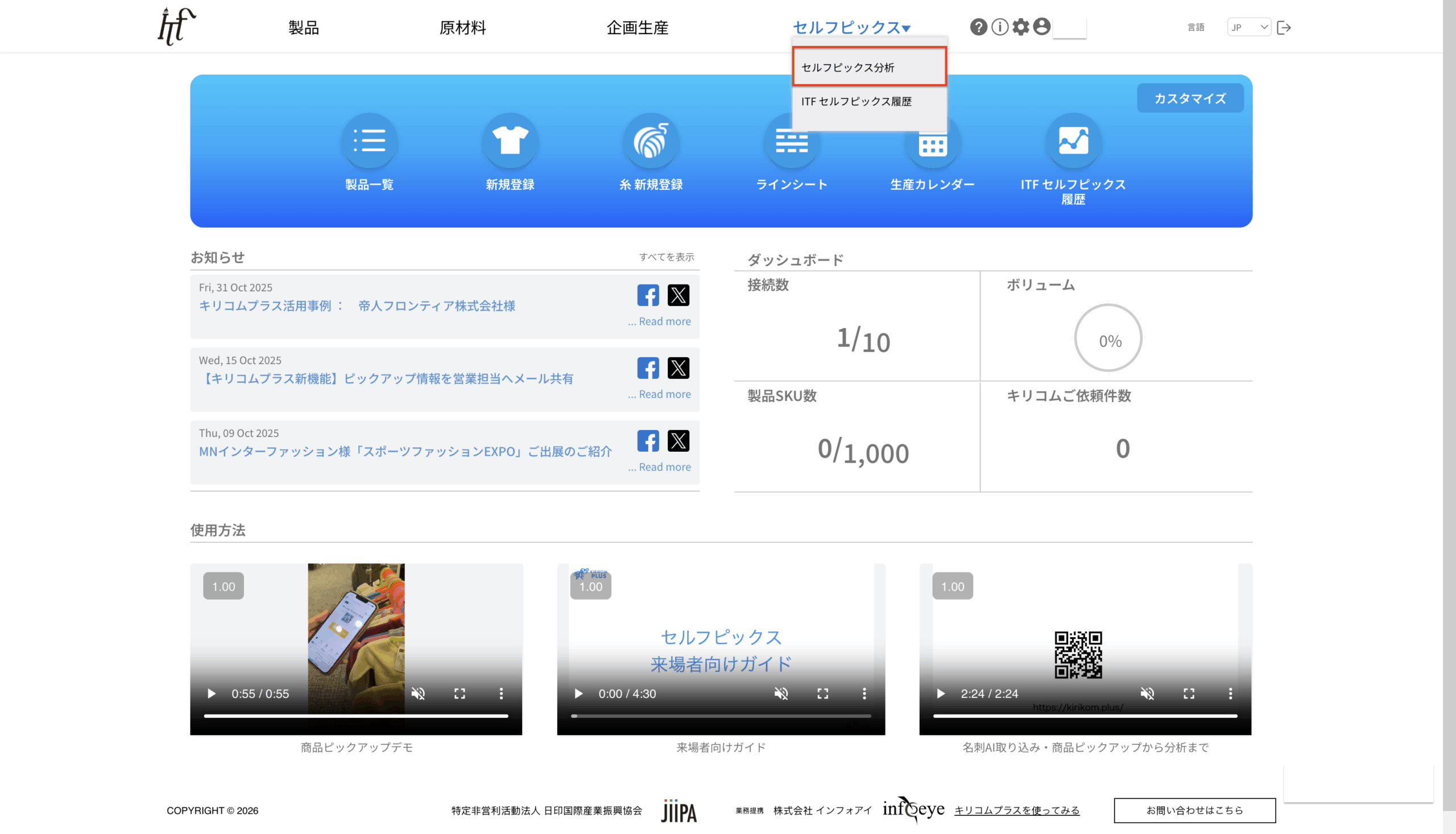 - 上部メニュー「セルフピックス」を押下し、プルダウンから「ITF セルフピックス履歴」を選択します。