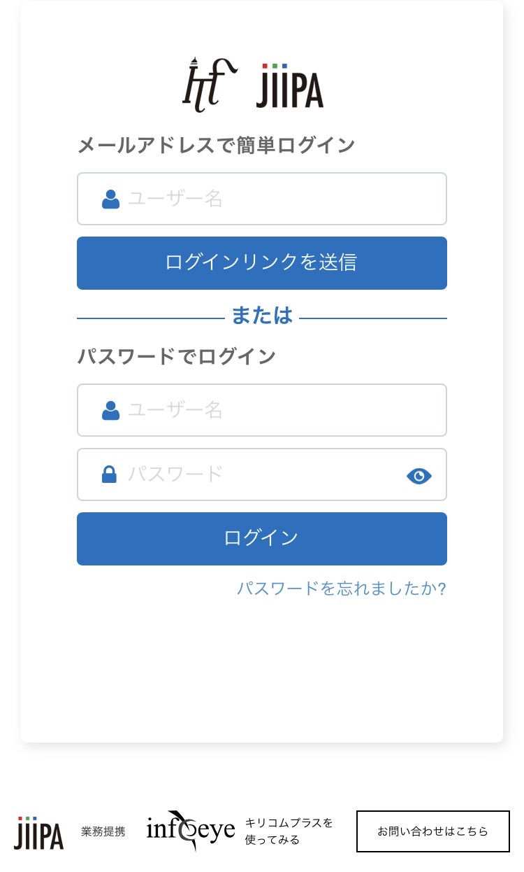 - ご登録のメールアドレスを入力し、送信されるダイレクトログインリンクからログインするか、「ユーザー名(メールアドレス)」と「パスワード」を入力してログインします。
