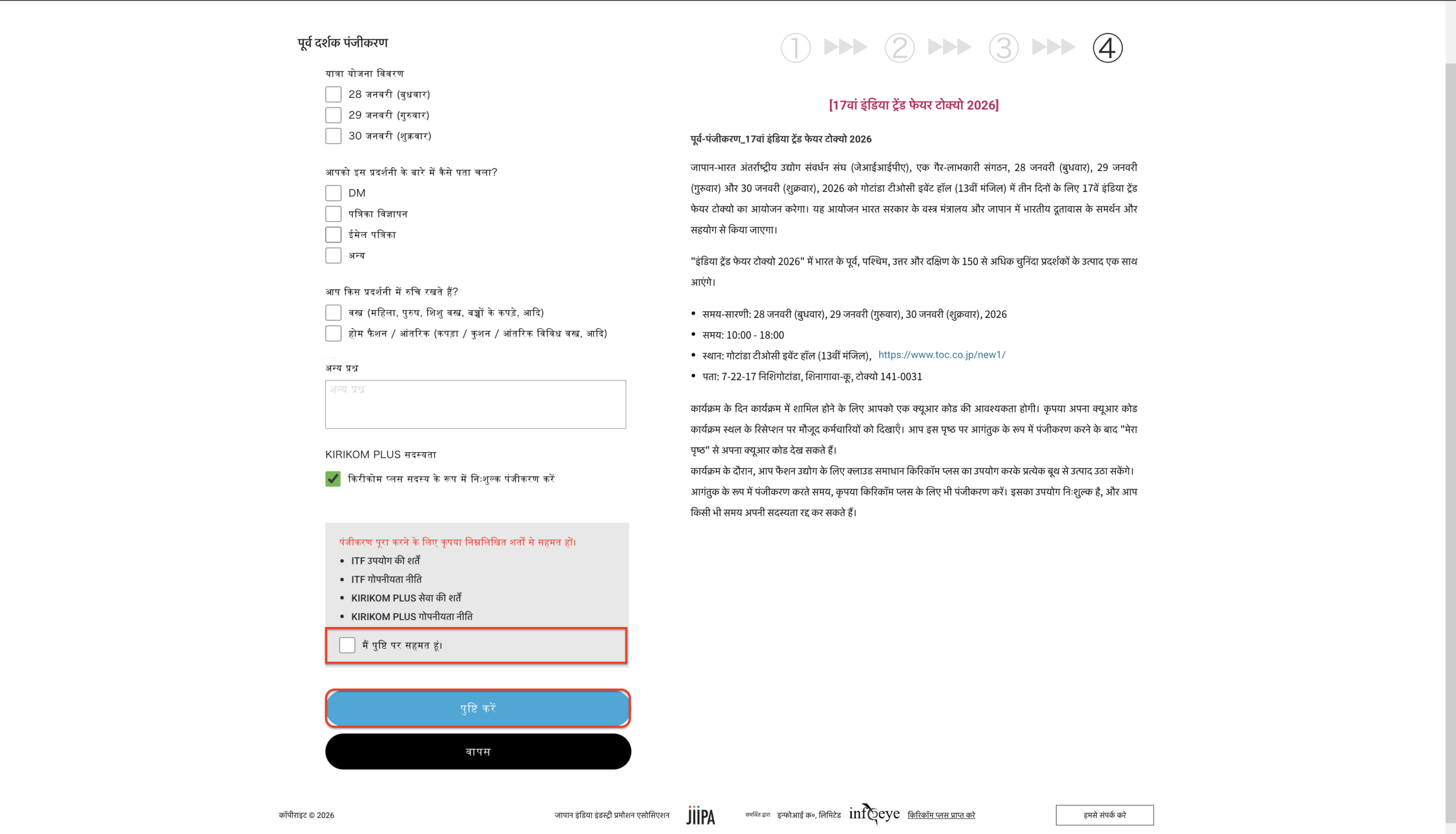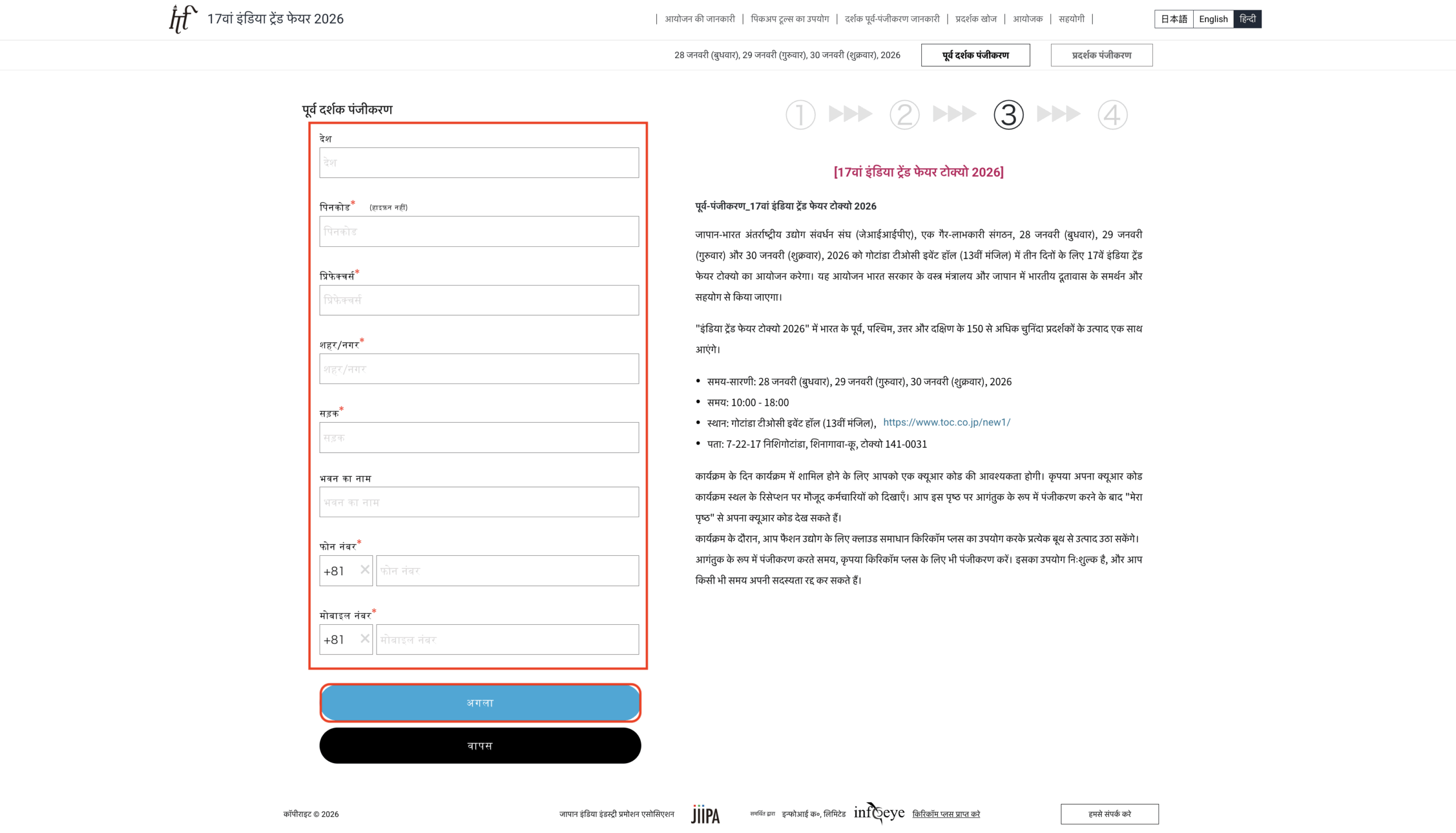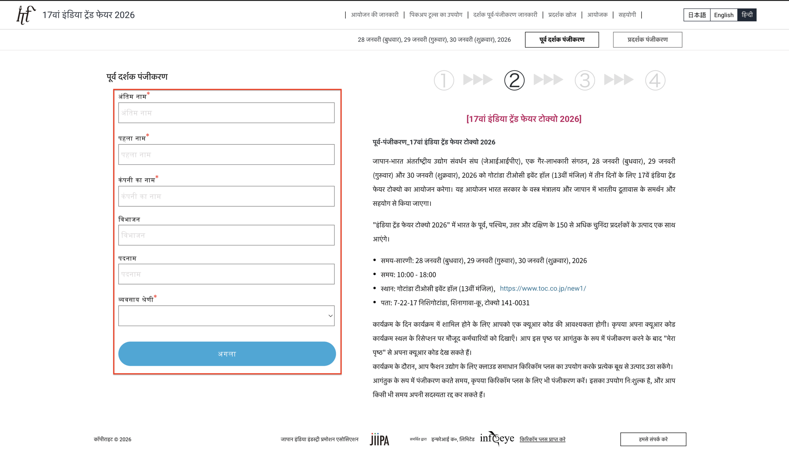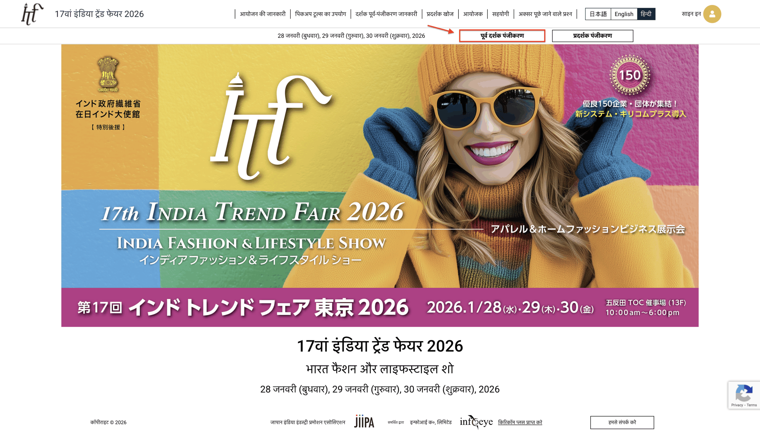 - 17वें इंडिया ट्रेंड फेयर टोक्यो 2026 के लिए वेबसाइट होमपेज के शीर्ष पर स्थित “पूर्व दर्शक पंजीकरण” बटन पर क्लिक करें।