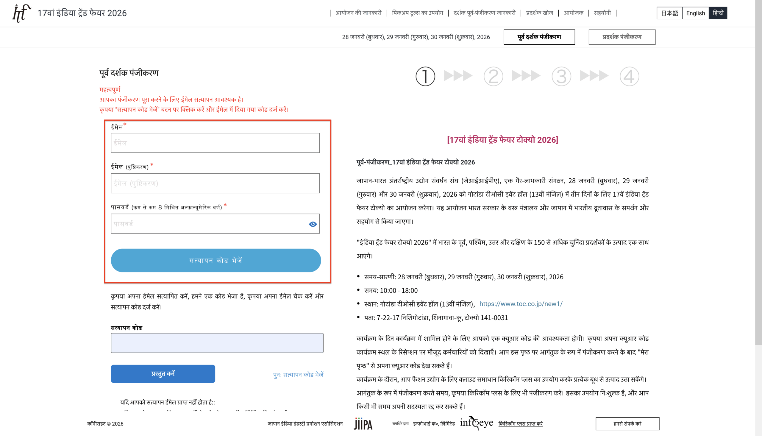 इंडिया ट्रेंड फेयर टोक्यो 2026 वेबसाइट से दर्शक के रूप में पंजीकरण करें