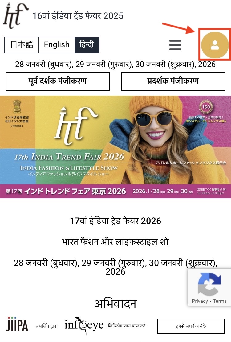 - इंडिया ट्रेंड फेयर टोक्यो 2025 वेबसाइट के ऊपर दाहिने कोने में “साइन इन” बटन पर क्लिक करें।